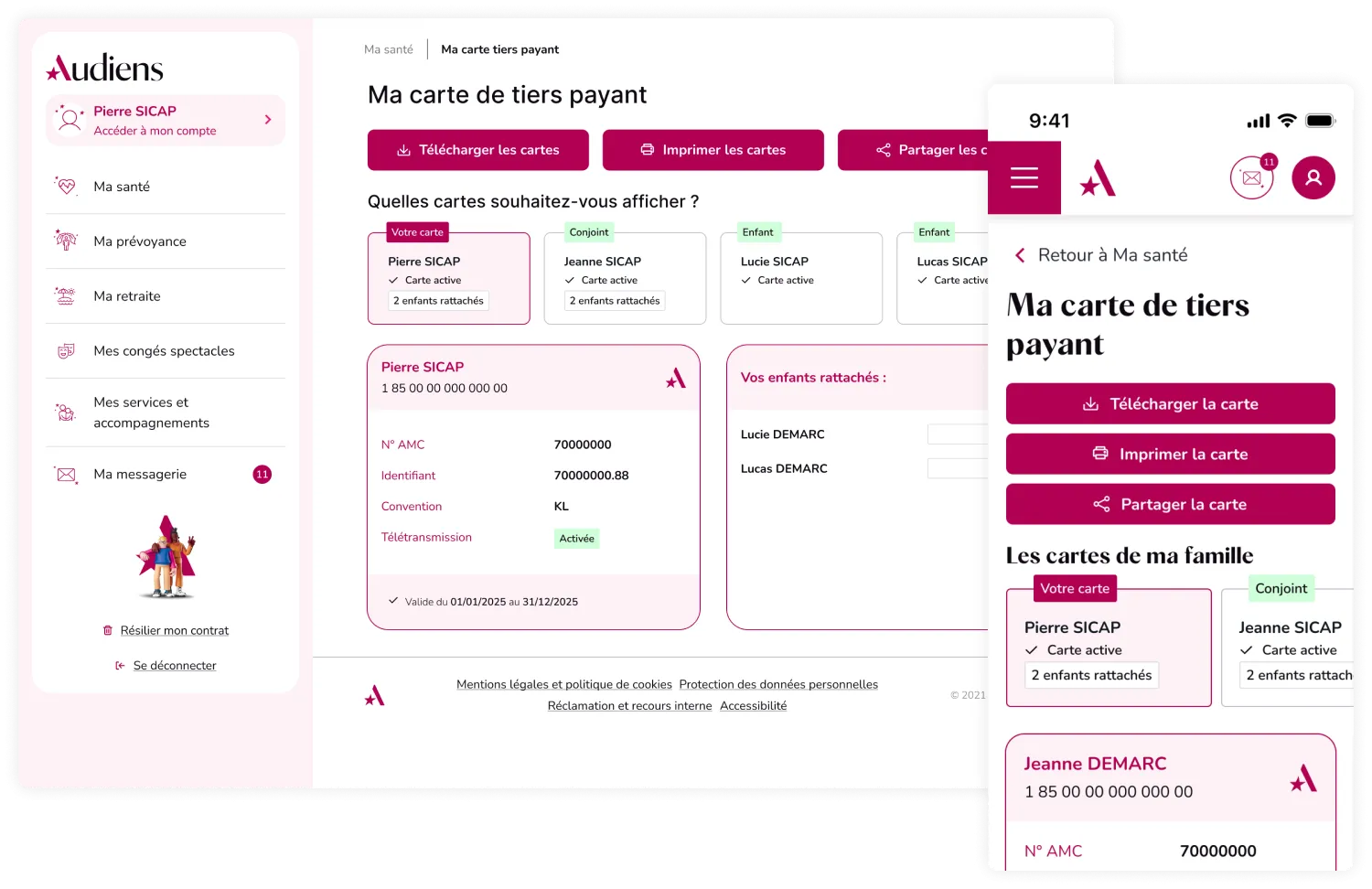 Accédez à votre carte de tiers payant directement depuis votre Espace client. Fini la recherche dans plusieurs menus, plus simple d'accès, facilement partageable, sans jamais l'oublier, la solution pratique pour tous vos rendez-vous santé !